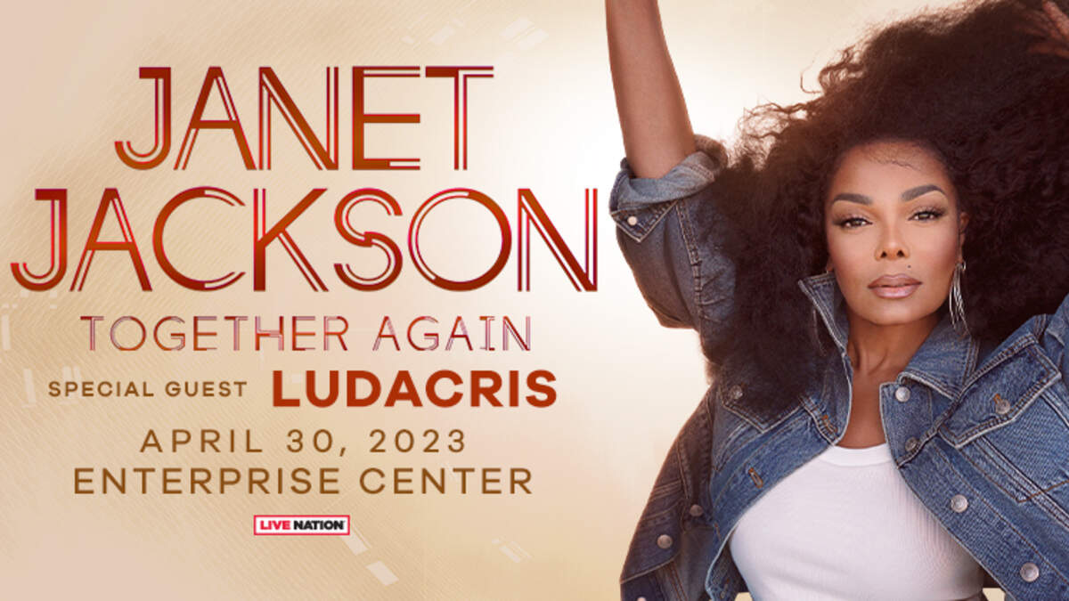 Janet Jackson; Together Again With Special Guest Ludacris April 30th, Enterprise Center Presale: Thursday, December 15 11AM-10PM Password: CHEER Public On Sale: Friday, December 16 11AM https://www.ticketmaster.com/event/06005D87B90D5365