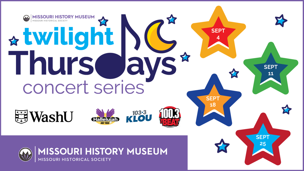 As the weather cools down, September welcomes the long-awaited return of concert season at the Missouri History Museum! This popular, free outdoor concert series on our new Edward and Margaret Imo Family Plaza brings a lineup of spectacular shows from local musicians. Grab your blankets and lawn chairs, pack your picnic basket, and listen to music underneath a beautiful Forest Park sunset. Some of the area’s best food trucks will also be on hand each week. Please note that barbecue grills are prohibited. Come on out to Twilight Thursdays at the Missouri History Museum! Sponsored by iHeartmedia. Info at Info at mohistory.org.