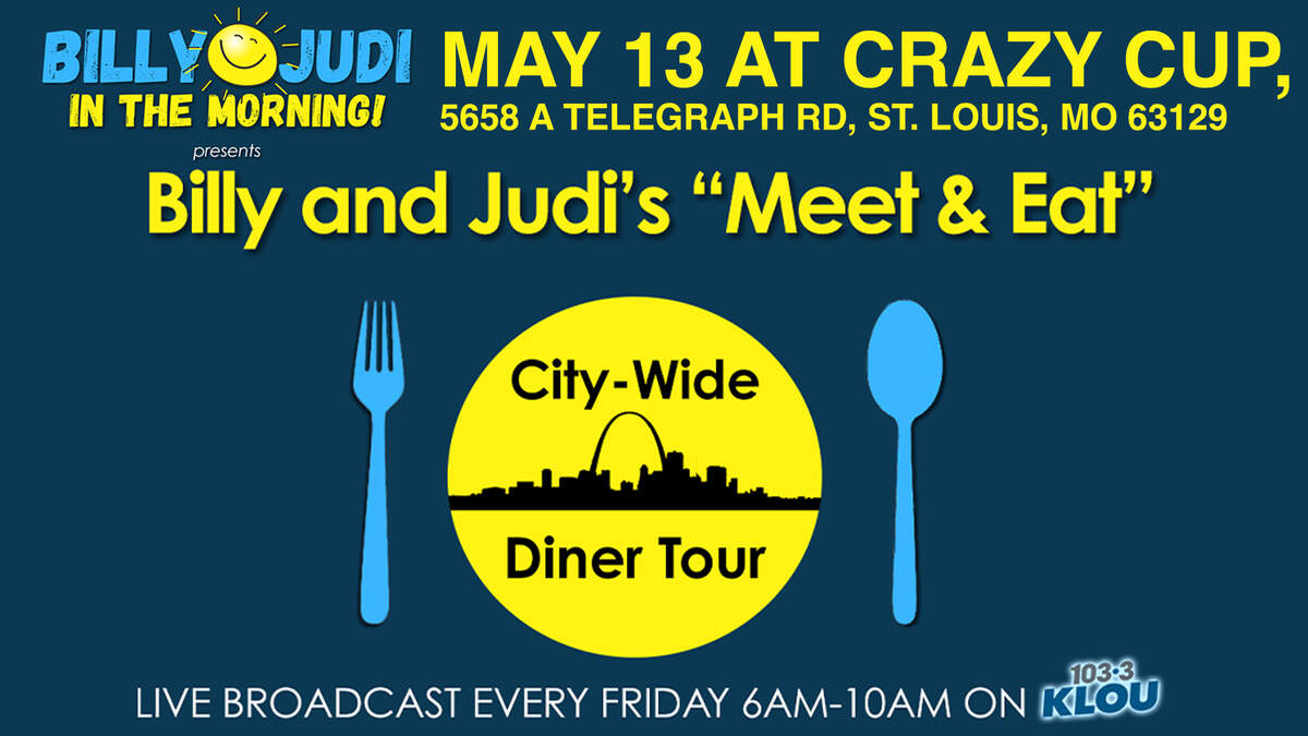 Join Billy and Judi for their next stop on the Meet and Eat Tour. They are broadcasting live this Friday morning from 6a-10a in South County at Crazy Cup 5648 A Telegraph Rd. Swing on by for some breakfast.